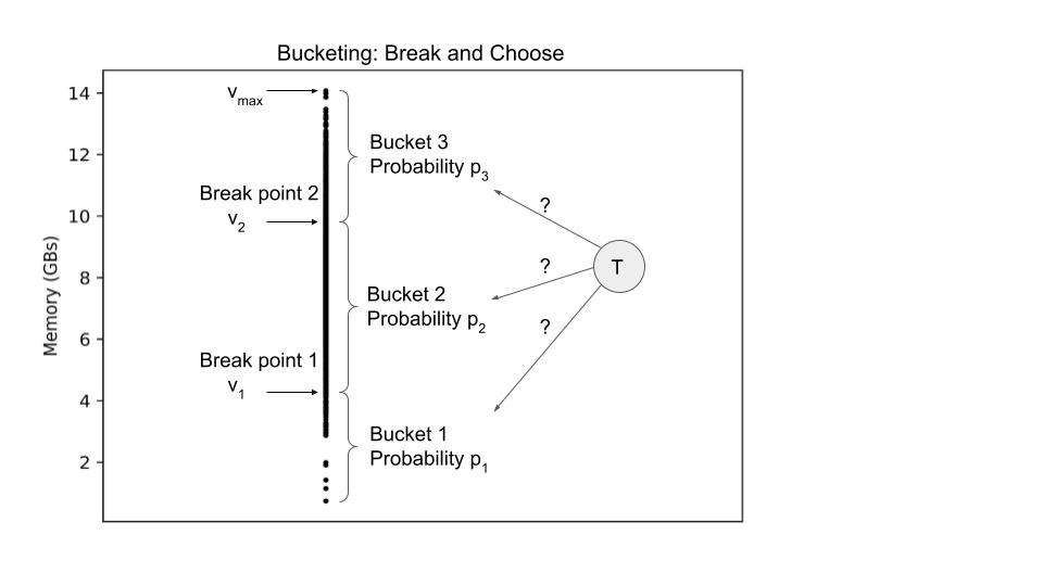 To predict resources of each task, we first collect resource records of completed tasks, group them into buckets of tasks based on their similarity in resource consumption, and probabilistically choose a bucket to allocate the next task, as shown in the example below.