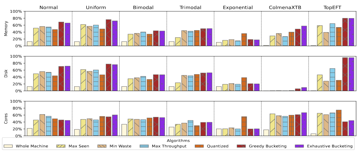 We compare the two algorithms with five alternative algorithms on 7 workflows with 3 resource types. Results show that Greedy Bucketing and Exhaustive Bucketing consistently outperform other algorithms by yielding the highest resource efficiency in the majority of cases.