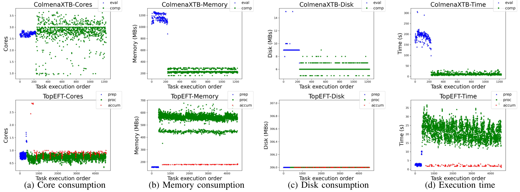 Since a manual resource specification for each task is unreliable, an automated solution is required. Such solution needs to be (1) general-purpose (can work with any workflow), (2) prior-free (no prior information is used as workflows may change over each run), (3) online (collect information and run as the workflow runs), and (4) robust (performant on many distributions and unexpected changes). The below figure shows two workflows: ColmenaXTB (top row) and TopEFT (bottom row). Resource types range from core, memory, disk, and execution time from left to right.