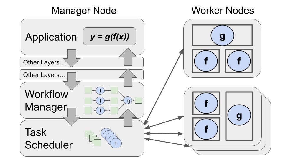 In the figure above, an application submits many invocations of two functions: f and g. The invocations are transformed into tasks through many layers and scheduled on worker nodes. Note that the resource specification of each task may be unknown.