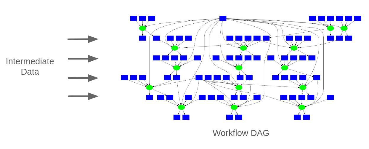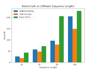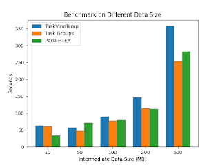 In addition to adding temporary files to the Parsl/TaskVine executor, the talk presented ongoing work on the development of intermediate data-based "task-grouping" in TaskVine and extending it to the TaskVine executor. The concept of grouping related tasks may sound familiar to Pegasus users or other pre-compiled DAG workflow systems. Currently task-grouping is focused on scheduling sequences of tasks which contain intermediate dependencies. The desired outcome is for TaskVine to interpret pieces of the DAG to identify series of sequentially-dependent tasks in order to schedule them on the same worker, such that intermediate data does not need to travel to another host. Extending this capability to Parsl brought about an interesting challenge which questioned the relationship between DAG manager and executor.